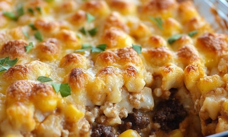 This Cowboy Casserole is a comforting, hearty dish perfect for family dinners. It layers seasoned ground beef with a creamy, savory sauce and sweet corn, then tops it all with melted cheddar and golden, crispy tater tots.