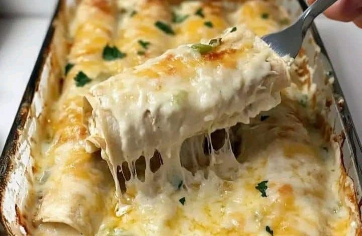 These White Chicken Enchiladas offer a creamy, flavorful twist on the classic. Tender shredded chicken and mild green chilies are wrapped in soft tortillas, covered in a homemade sour cream white sauce, and baked until golden and bubbly.