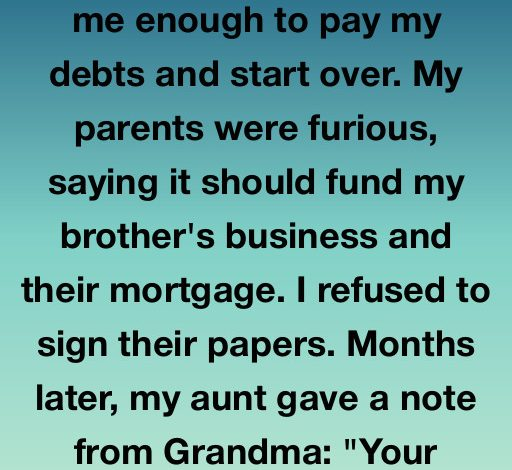 The night my aunt handed me Grandma’s note, I read it over and over until the letters blurred. Her handwriting was shaky, but her words were steady:“Your parents will try to take this from you. Don’t let them. You’ve always been the one who needed a chance. Take it.”It felt like both a warning and a hug. I cried like a child on the twin bed in the apartment I had finally managed to rent. I wasn’t the favorite. My parents were loud—opinions, expectations, ultimatums. My brother was the charmer; his mistakes always came with second chances. I was quiet,…